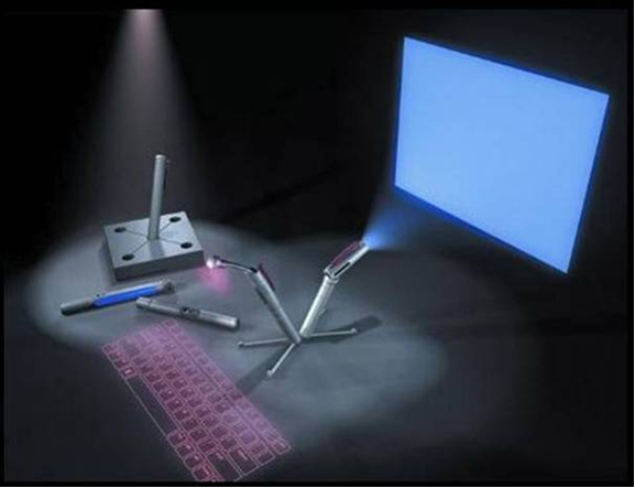 Comment le tout fonctionne? Très simple, un des « crayons » projette sur une surface plane, l’autre projette un clavier de type hologramme sur la table et les autres unités contiennent la mémoire et les processeurs, web cam etc. dont la technologie « Bluethoot » active les connections sans fil. Impressionnant? Je crois que ceci est juste une preuve de plus que notre avenir est dans l’infiniment petit.Ordinateur du futur