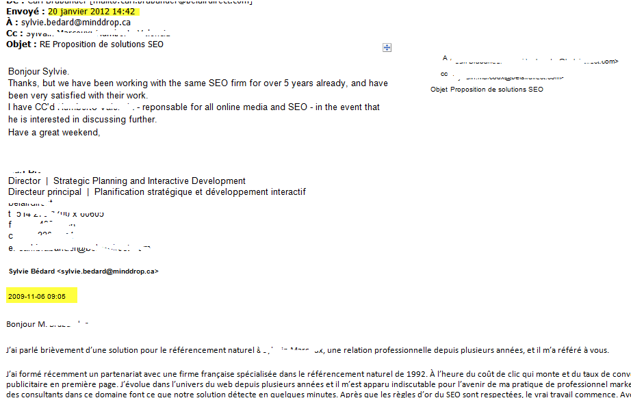 À mon retour de vacances, j’ai eu toute une surprise. J’ai eu droit à une réponse d’un client potentiel que je n’attendais plus. Voici en gros le contexte. C’est un client que j’avais sollicité pour offrir mes services de référencement suite à une suggestion d’un ami qui travaillait dans cette entreprise à l’époque. Je faisais d’ailleurs référence à cet ami dans mon courriel. J’ai relancé 2 fois ce prospect, mais sans réponse de sa part, sauf par le biais de mon ami, qui me confirmait qu’il était très occupé et qu’il avait bien reçu mon message. C’était le 6 novembre 2009 (j’ai mis une copie censurée dudit courriel pour fin de preuve). Devant l’absence de réponses, j’ai abandonné en me disant que son compétiteur serait sûrement heureux de mon offre. Faut-il que je précise que j’offre l’exclusivité dans un secteur donné, alors cette grosse compagnie était donc passée aux oubliettes dans mon livre.