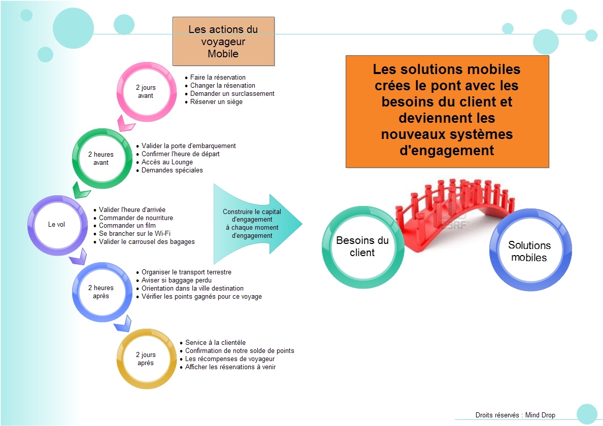 La beauté des solutions mobiles, c’est qu’elles permettent non seulement d’améliorer l’expérience usager, mais elles permettent de distancier l’expérience de service d’un simple processus sans valeur ajoutée. Avec la notion de géolocalisation qui enrichit les capacités fonctionnelles, on anticipe maintenant vos besoins et on peut prendre les devants. L’hôtel peut savoir si vous êtes arrivé dans le stationnement ou votre ligne aérienne peut vous confirmer l’heure de départ de votre avion sans que vous ayez à courir pour obtenir l’information. Tout est une question de contextualisation qui permet une pertinence accrue des interventions de l’entreprise avec son client. Tout cela est appuyé par les analyses prédictives rendues possibles grâce à la richesse des informations maintenant disponibles. Les moments de vérité traditionnels, maintenant transformés en moments d’engagement. Une révolution qui demande une nouvelle vision des dirigeants d’entreprise.