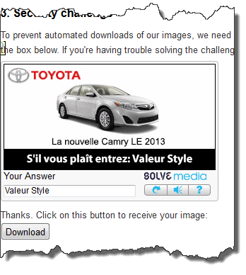 En entrant la mauvaise réponse, le captcha publicitaire m’a retourné une autre image. Je n’en revenais pas… il me demandait quelle était la marque annoncée dans le captcha précédent. Dieu merci, je connaissais la réponse, car je pense qu’après deux coups l’usager est à quelques secondes de quitter le site. Par contre, pour améliorer le taux de rétention et la mention spontanée dans la mesure de l’efficacité publicitaire, je donne 10 sur 10! Tout cela de manière toute simple pour le propriétaire du site. Une inscription sur le site de SolveMedia et j’imagine que le compte se créé et que vous obtenez un code HTML qui vous convertira en média publicitaire. J’ignore le potentiel de revenus, mais je sais que considère cette solution vu la pertinence et l’intelligence de cette forme de publicité… du moins pour mon blogue!