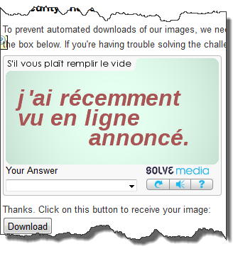 Alors voici que la compagnie SolveMedia invente une nouvelle façon d’utiliser votre espace « captcha » pour encaisser des revenus au profit d’une expérience moins aliénante pour l’usager et hautement interactive pour l’annonceur! Il fallait y penser. Que des gagnants, en commençant par la compagnie SolveMedia. Il est rare de voir que tout le monde est gagnant dans la chaîne de publicité et j’avoue ici que c’est le summum de la futilité au service de l’utilité. Voici en gros comment le tout fonctionne : vous êtes soumis à une publicité dans votre langue (même si dans ce cas le formulaire est en anglais… étrange, mais…) et on vous demande poliment de rentrer la réponse inscrite dans l’espace prévu. Difficile de ne pas voir la publicité, vous devez la lire! Attendez, ce n’est pas tout! J’ai fait une erreur volontairement pour voir la suite.