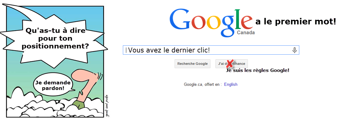 Aujourd’hui, vous êtes les seuls à déterminer la valeur des contenus (enfin vos clients), et les clients sont les seuls avec le pouvoir de dire à la marque X ou Y; « on aime ce que vous faites! ». C’est vraiment le Jour du jugement dernier imposé par Google… mais nous sommes ce dernier clic ! Lorsque vous le faites, vous justifier les investissements, les dollars engagés à nous séduire, et vous permettez à ce cercle infernal pour notre attention de continuer. Au final, si tout le monde décide de s’abreuver de bons contenus sans les partager, sans les commenter, sans les aimer et sans les référer, tout ce beau plan de Google va s’écrouler, emportant avec lui l’espoir d’un référencement naturel « payant pour l’entreprise » au profit de la publicité « payante pour Google » sur le Web, à moins bien sûr que vous décidiez ne plus cliquer sur les liens publicitaires. Nous sommes collectivement la clé au succès du référencement naturel, nous sommes les juges. Et à voir comment les lecteurs sont avares de « j’aime » et sursollicités pour lire de bons contenus… hum!!! je parierais que la 1re place dans les moteurs de recherches doit d’abord commencer par la 1re place dans le cœur des clients.