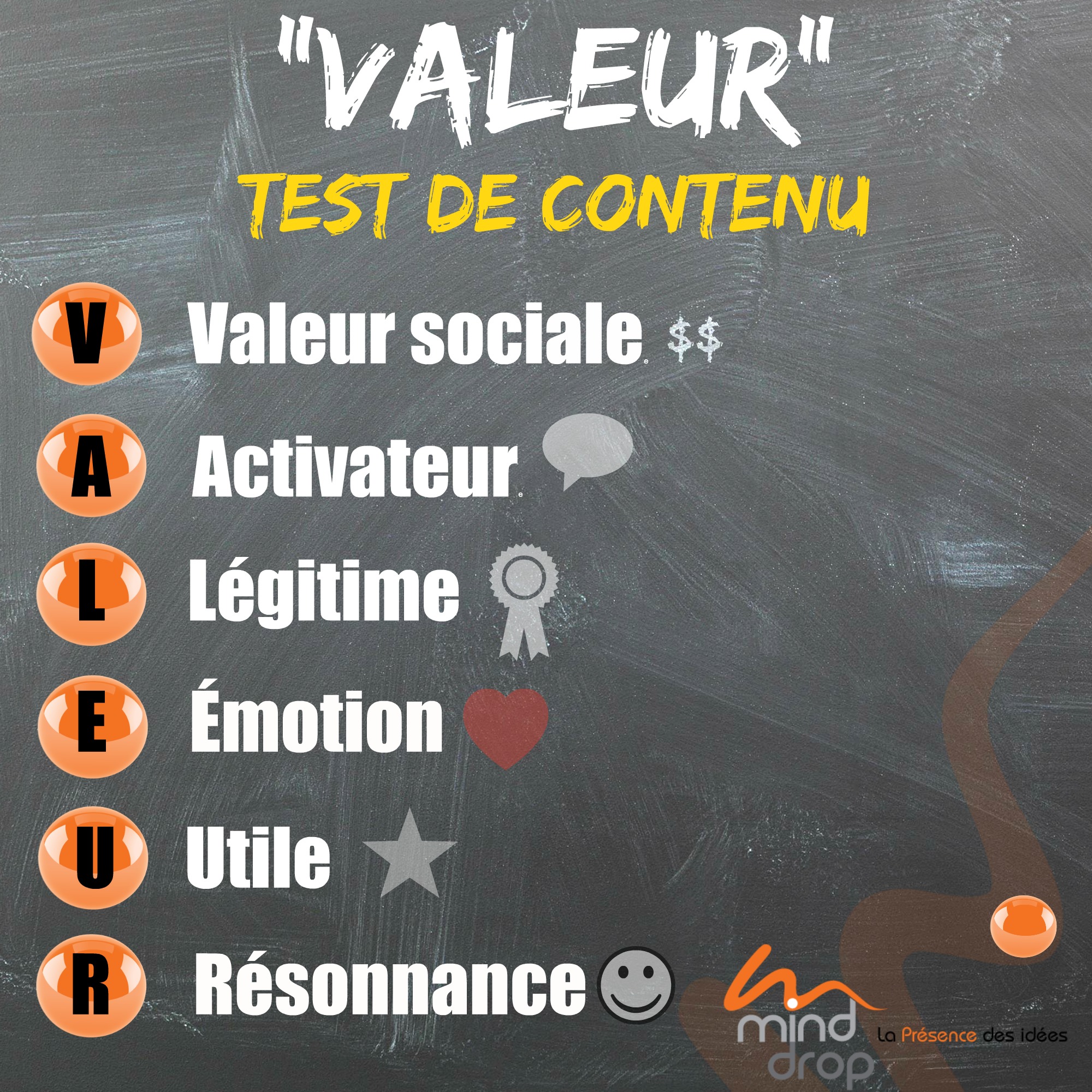 Je ne peux pas répondre à toutes les questions dans ce billet (j’ai de nombreux articles sur le sujet des contenus), mais je répondrai à la question sur les critères de qualité pour une bonne publication. Dans le cadre d’une formation, j’ai concocté une formule simple pour assurer que vous publiez toujours de manière optimale, et avec une méthode simple et accessible. Avec l’acronyme VALEUR, non seulement le mot en lui-même est-il évocateur, mais sa déclinaison est simple. La voici en détail :
