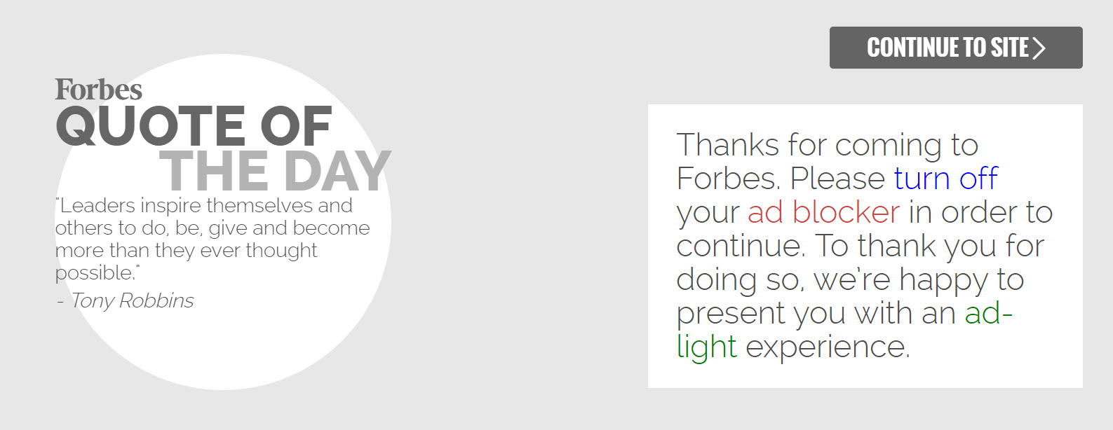 Évidemment, lorsque les entreprises souhaitent attirer l’attention de leurs publics cibles, elles doivent réfléchir sérieusement à la question afin de ne pas dilapider leur budget en vaines actions. Les plus riches auront l’avantage de parler avec des experts en agences reconnues, et les autres miseront sur leur créativité interne, et au passage, peut-être des conseils d’un consultant ponctuel. Dans mon livre – Le nouveau « P » du marketing : la Présence – je prédisais déjà dans la 1re version qu’un jour, seuls ceux qui n’ont pas les moyens de se priver de publicité seraient les cibles involontaires du modèle actuel. C’est déjà bien commencé. Des médias, comme le Forbes, osent ce pari du modèle payant sans publicité, et gratuit avec publicité. Il est possible de détecter si votre fureteur bloque la publicité intrusive et de vous proposer de débloquer la publicité ou de payer un abonnement.