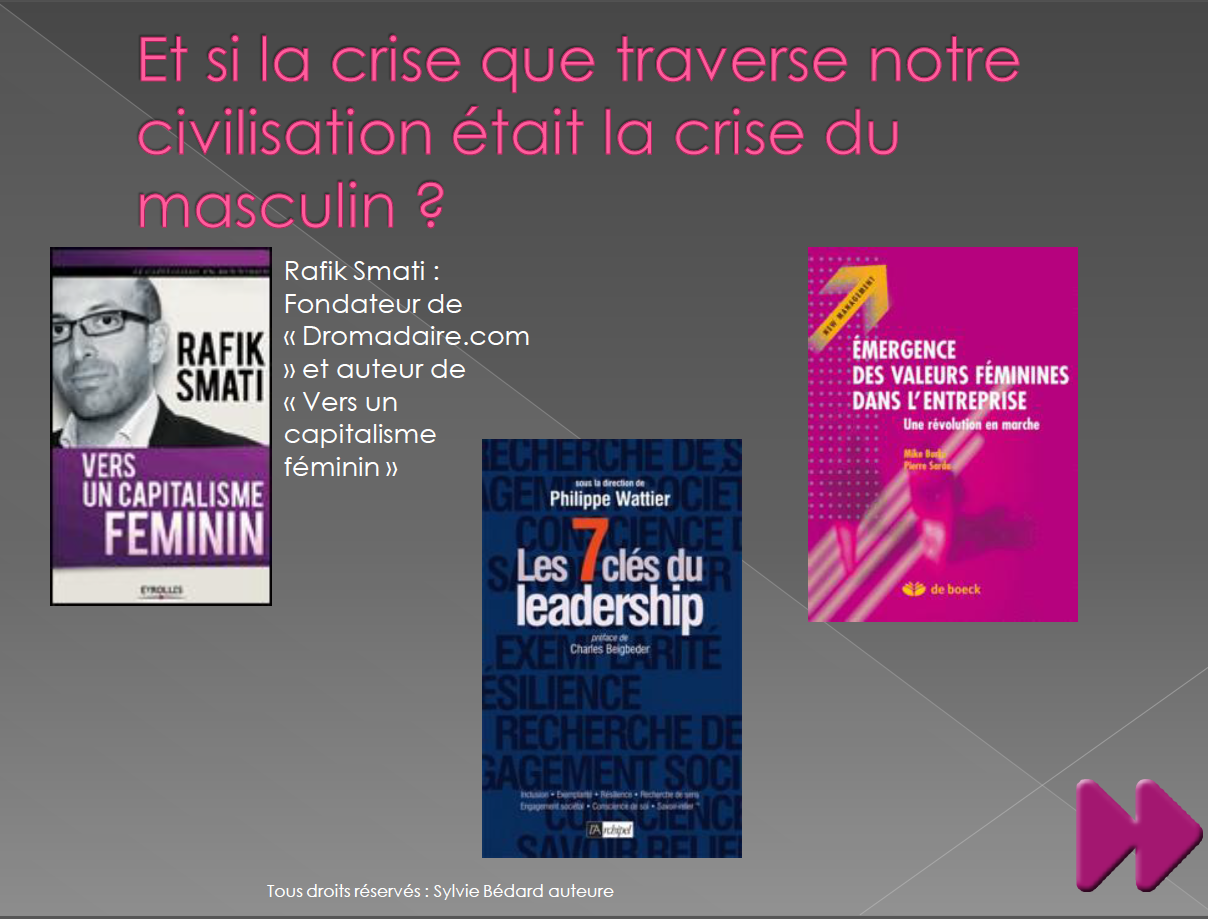 Sans vouloir reprendre de manière exacte un billet déjà écrit en 2014, il m’apparaît important de préciser d’emblée que le capitalisme féminin a d’abord été proposé par trois hommes au cours de la dernière décennie. Ironique n’est-ce pas? À l’instar de Sophie Brochu, chef de la direction d’Énergir (ancien Gaz Métro) qui disait devant caméra en mars 2016, en entrevue à deux hommes en or, que toute personne qui a une tête sur les épaules devrait être féministe! Rien de moins. L’argumentaire étant plein de bon sens. En effet, comment pourrions-nous être contre le féminisme qui dit en termes simples : égalité pour les hommes et les femmes, et ce, sur tous les plans. Mais les auteurs Rafik Smati, Philippe Watier et les coauteurs Mike Burke et Pierre Sarda sont allés encore plus loin en prédisant que la crise qui traverse notre civilisation serait la crise du masculin, et elle l’est. Que notre société étant en mutation, elle évoluait plus vers un capitalisme féminin.
