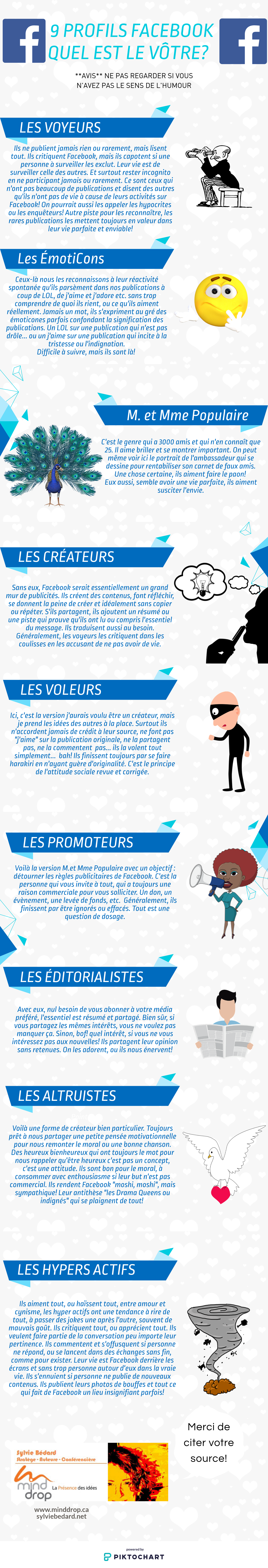 À vous de juger de votre profil maintenant. Cependant, n’ayant pas voulu aller trop dans les détails, j’ai limité à 9 profils d’usagers Facebook. Bien sûr, l’idée est la même avec les autres médias sociaux et il n’y a rien de scientifique ici. Mais après toutes ces années à utiliser Facebook, je pense avoir une bonne lecture de la situation. Il faut toutefois un peu d’humour, et aussi de l’autodérision pour apprécier ce classement. Bien sûr, nous pouvons être plus d’un profil selon l’humeur ou notre état du moment, mais vous devriez retrouver le vôtre et celui de quelques-uns de vos amis. J’ai fait un regroupement dans hyper actif pour la catégorie, je publie tout ce que j’aime, les petits chats, les animaux, les enfants, la bouffe etc…