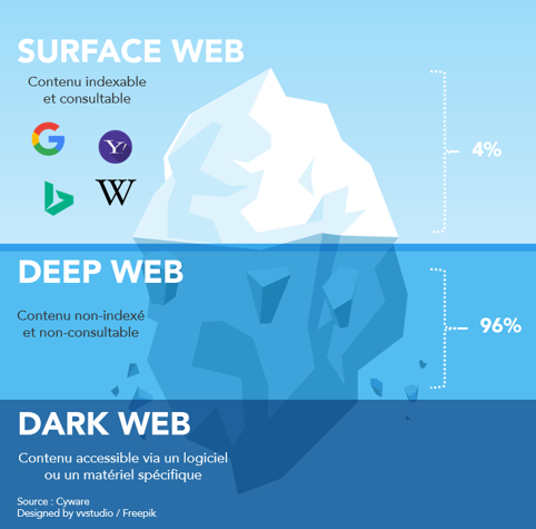 Cette partie du Web profond représente 96% de l’information. Il n’est pas indexé et en principe non-consultable sauf si on sait comment.