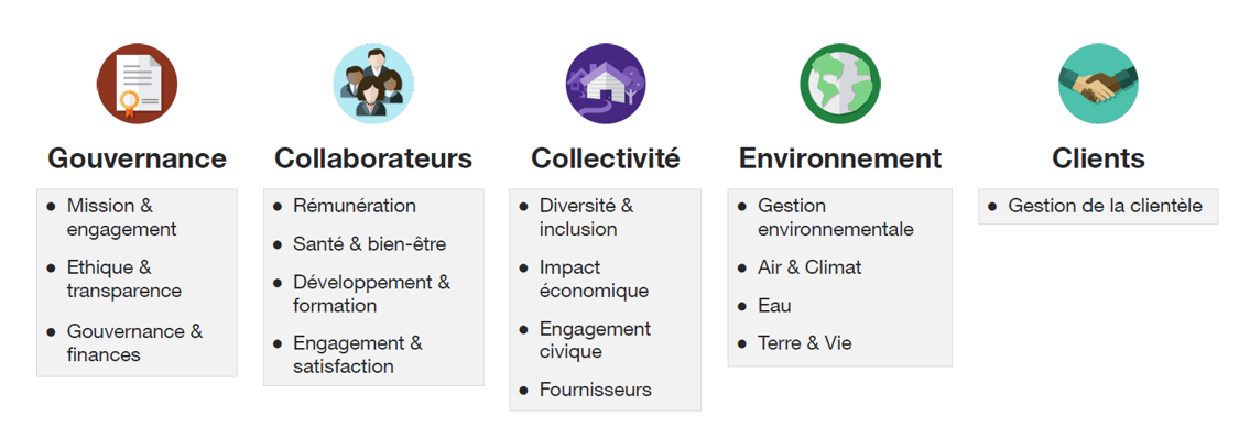 - Sociale : Justice, équité, diversité et inclusion (JEDI), satisfaction des employés et rémunération équitable, conditions de travail et droits de l’homme, santé et sécurité, satisfaction des clients et engagement communautaire.