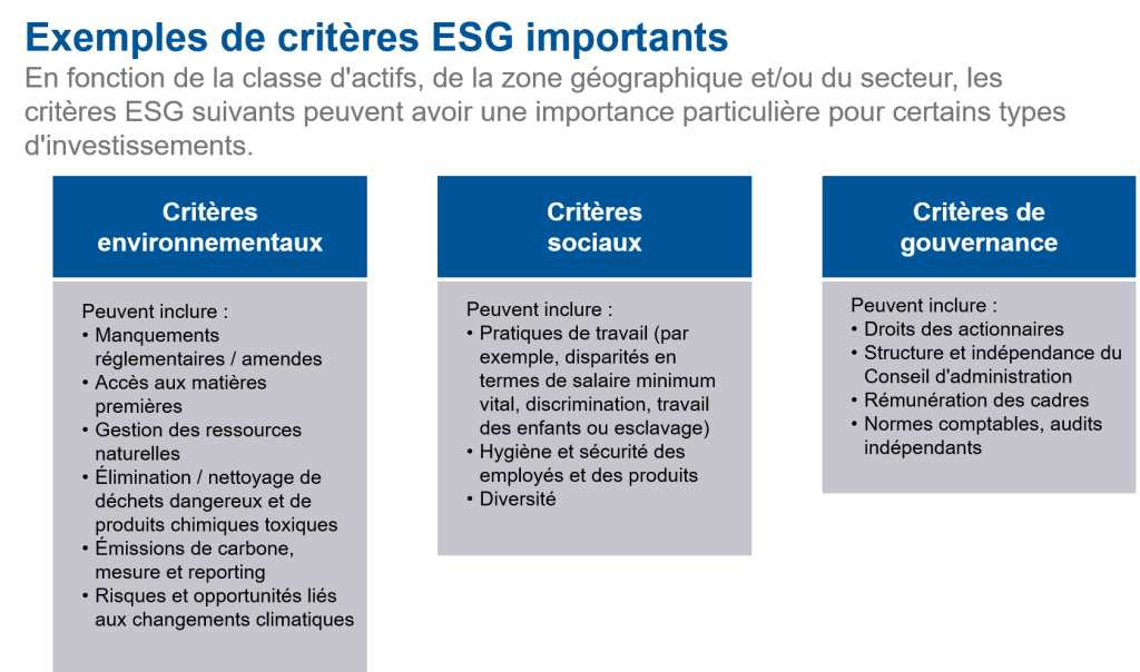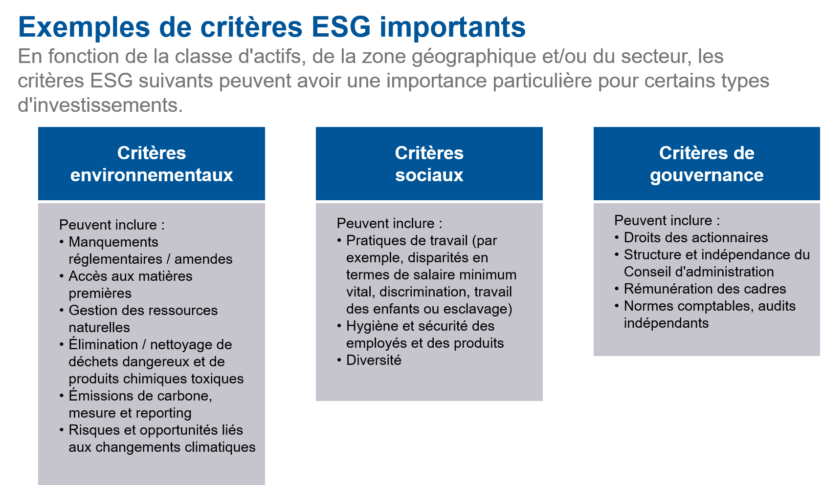 - Gouvernance : Engagement des actionnaires et des parties prenantes, codes de conduite et politiques internes, diversité du conseil d’administration, pratiques d’audit, investissement éthique et transparence.