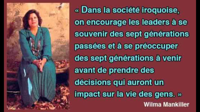 J’aime beaucoup la philosophie des autochtones en ce qui concerne la guidance des « leaders ». Ils doivent penser aux sept générations passées et aux sept à venir avant de décider de la direction à prendre. Une autre aussi : nous n’héritons pas de la terre de nos parents, nous l’empruntons à nos enfants.