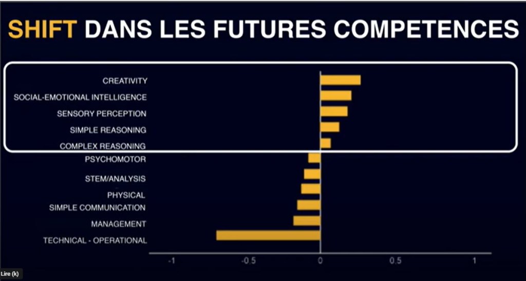 Cette capture d’écran provient d’une présentation faite par Delphine Le Serre lors du MTL Connecte 2023. Elle est fondatrice de EdHu2050.com qui vise à guider les institutions d’enseignements avec les nouveaux paradigmes des cursus scolaires à considérer. La fondation veut créer des écoles adaptées aux besoins de la nouvelle réalité. À voir. Une conférence éclairante ici.