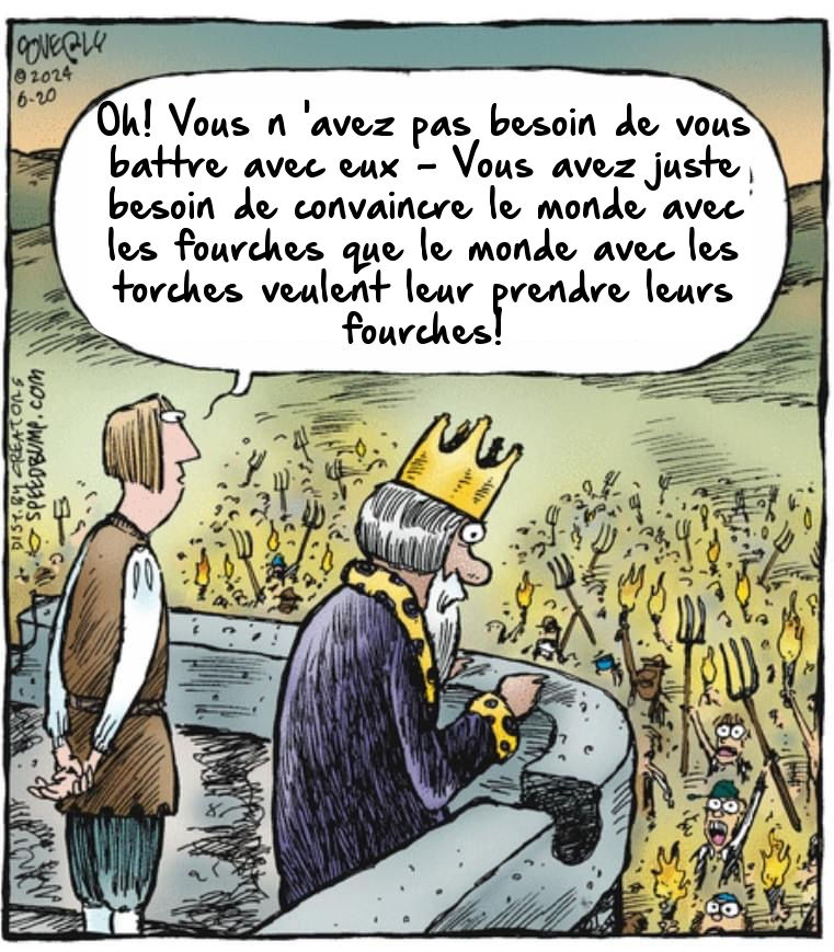 Nous savions que la moitié de la population de la planète allait voter en 2024. C’est la montée de la droite partout sur la planète. C’est la montée des couilles en béton, oserais-je dire. Parce qu’il faut bien admettre que devant le chaos, les moutons cherchent un loup qui promet de devenir végétarien une fois élu. Qui veut d’un berger qui dort pendant que le loup est dans la bergerie? Nous sommes dans un clivage idéologique à la hauteur de la bêtise humaine qui a pris par le cou le bon sens.