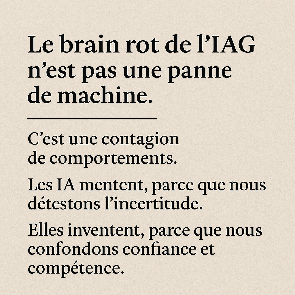 J’ai aussi demandé à ChatGPT et malgré mes références très documentées, il me donnait toujours l’angle que l’humain devient paresseux. À un moment, j’ai perdu patience, je lui ai demandé trois fois l’angle du « brain rot » de l’IA. Non, mais, il ne voulait pas admettre que la pourriture du cerveau était la sienne ou quoi? Sérieusement préoccupant.