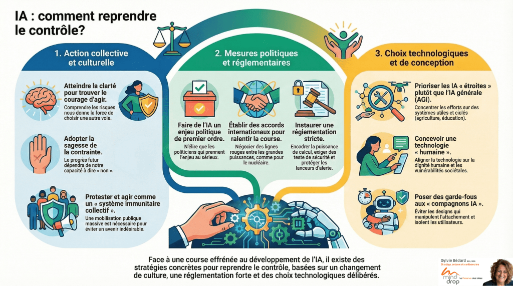 Pistes suggérées par Tristan Harris pour faire face aux enjeux de l’IA.